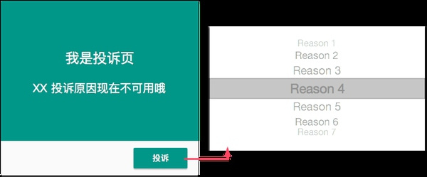 乍一看和案例一非常相似,但其实差别还是挺大的。案例一属于设计师自发尝试对体验改进,而案例二确实明确的业务需求,需要把没有的功能融入到现有方案中。拿到这个需求时,首先看到大概会涉及两个页面可以用来设计,分别是投诉页面和投诉原因选择页(这两个通常不会直接在一起,但是后者有可能以弹层的形式出现,当然也可能新开页面),于是闪过几种可能的处理方案。