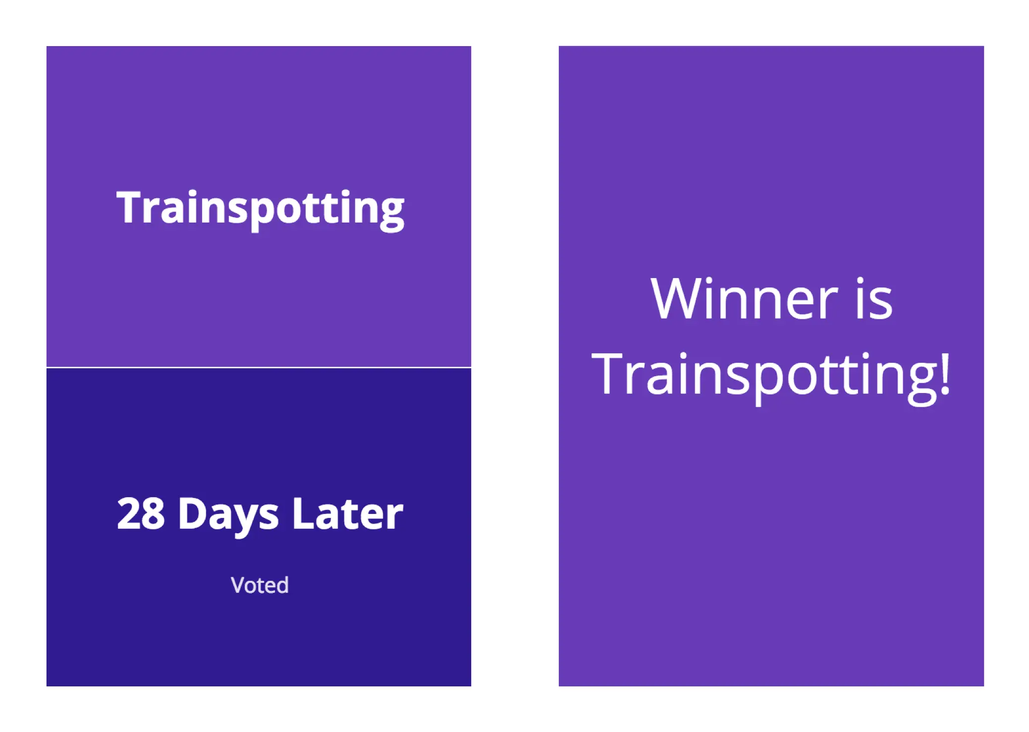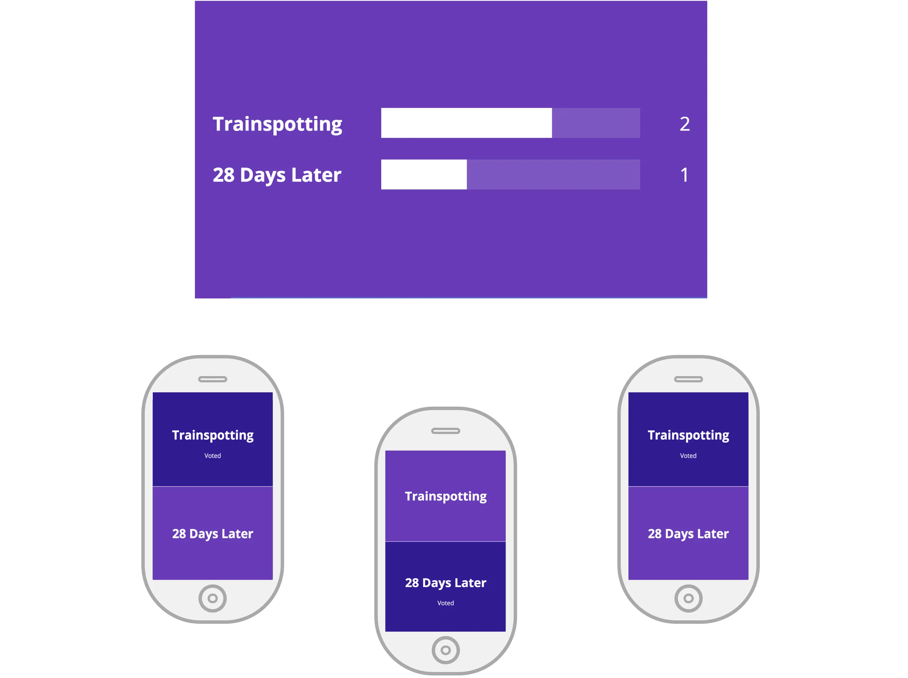 And... that's it! We now have a complete, functioning application. Try opening the results screen on your computer and the voting screen on a mobile device. You'll see the actions applied on one device immediately taking effect on another - which always feel magical: Vote on one screen, see the results view update on another screen. Click "Next" on the results screen and see the vote proceed on your voting device. To make it even more fun, arrange a vote with some friends the next time you get together!