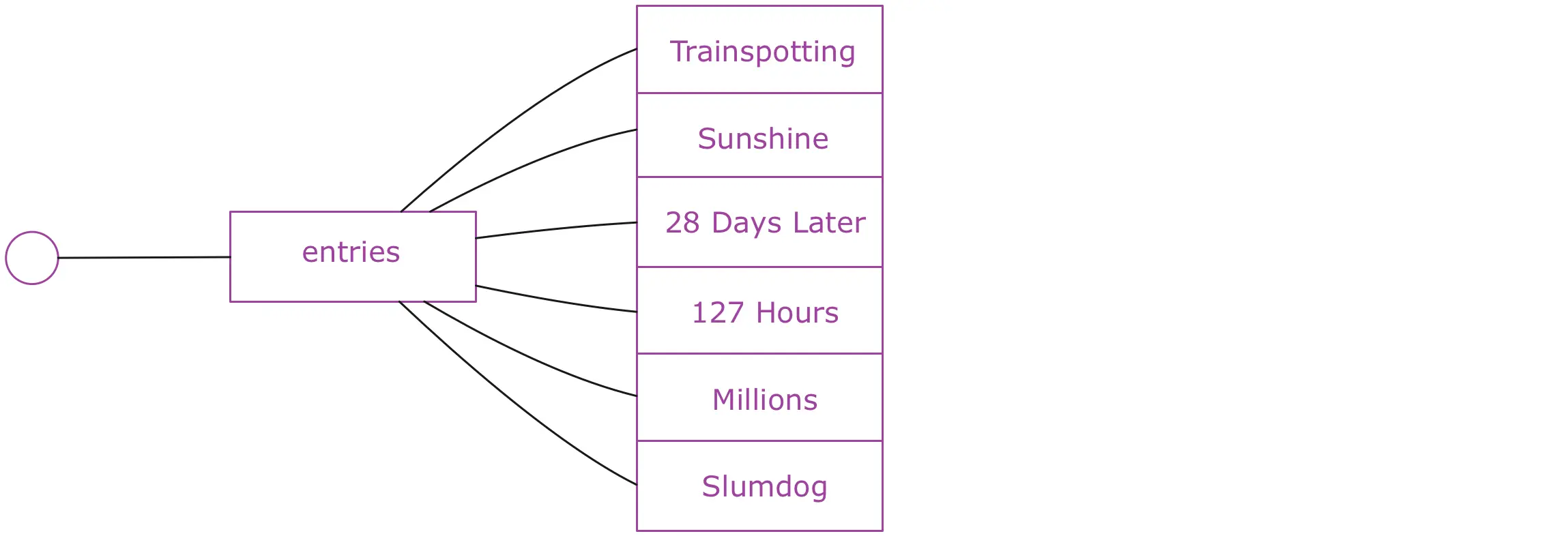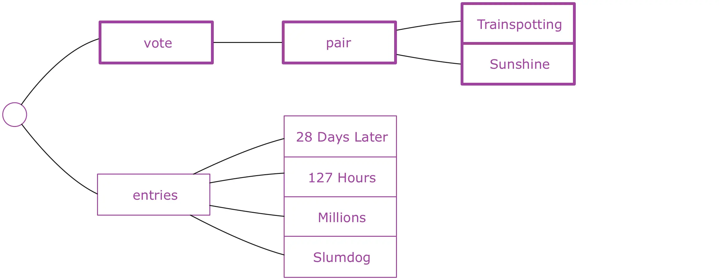 So, let's look at what the state tree of our voting app might be. The purpose of the app is to vote on a number of items (movies, bands, etc.). A reasonable initial state for the app might be just the collection of items that will be voted on. We'll call this collection entries: