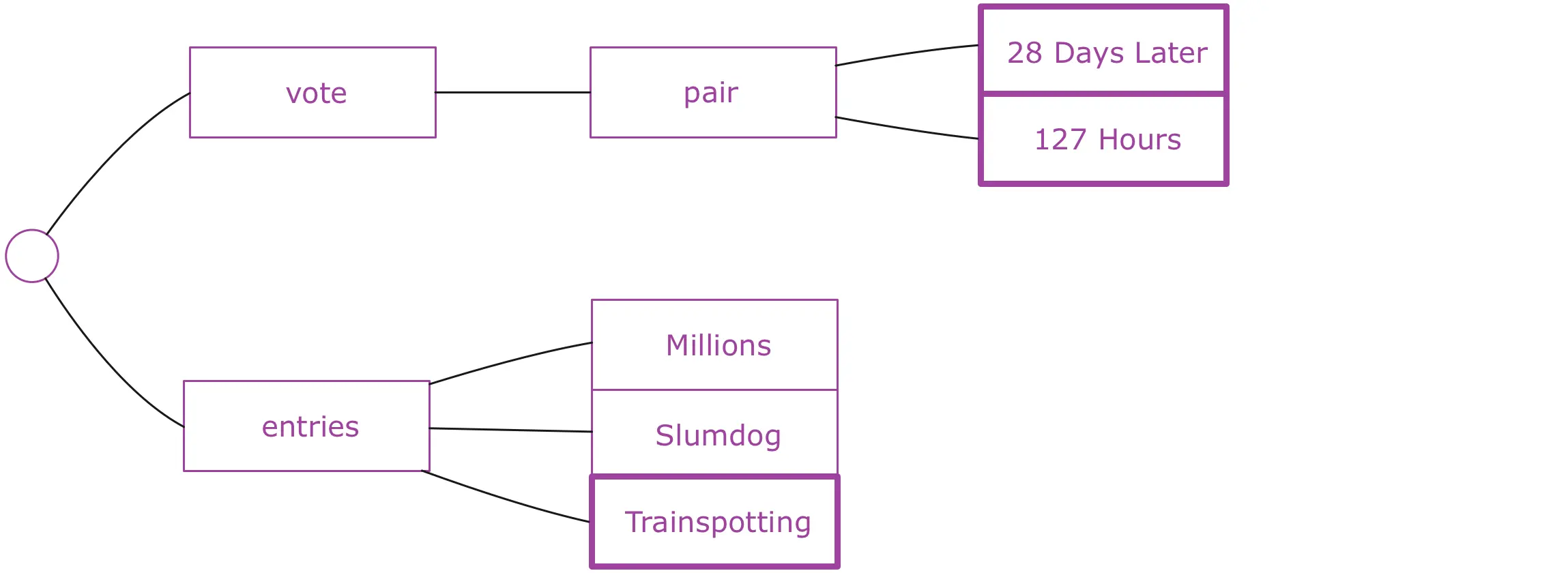 Once a vote is done, the losing entry is thrown away and the winning entry is back in entries, as the last item. It will later be voted against something else. The next two entries will then also have been taken under vote: