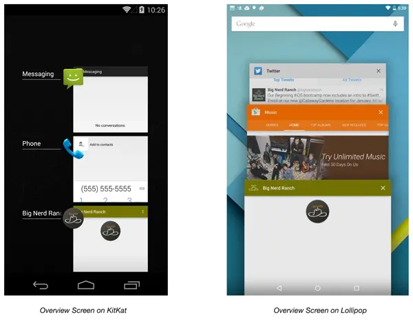 在 Lollipop 之前,总览画面是不可设置的。它所显示的内容包含应用程序的标签(label),launcher icon,还有用户在应用程序中最后操作的页面的截图。