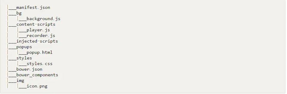 组织你的Chrome插件,能更好的让你分清楚不同的文件的不同作用。不同的项目的组织结构都可以是相似的,下面列举了一种组织形式,大家可以参考一下。