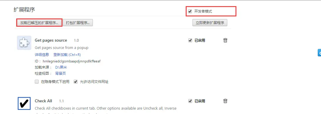那么怎么测试我们的插件呢?在Chrome地址栏输入chrome://extensions,打开开发者模式,然后点击加载已解压的扩展程序,选择相对应的目录就OK了,如果你的插件修改过,别忘了点一下重新加载(Ctrl+R)按钮。
