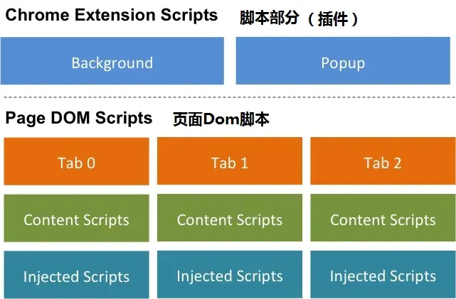 在任何时候,popup和background都只有一份,相比较起来,如果你有多个Tab(这里的Tab指的是Chrome当中的选项卡,也就是一个窗口页面),那么Content Scripts和 Injected Scripts会运行在每一个Tab当中,也就是可以跨选项卡。当然,你可以指定往哪个Tab当中去注入Scripts,也就是说,注入操作是可选择的。