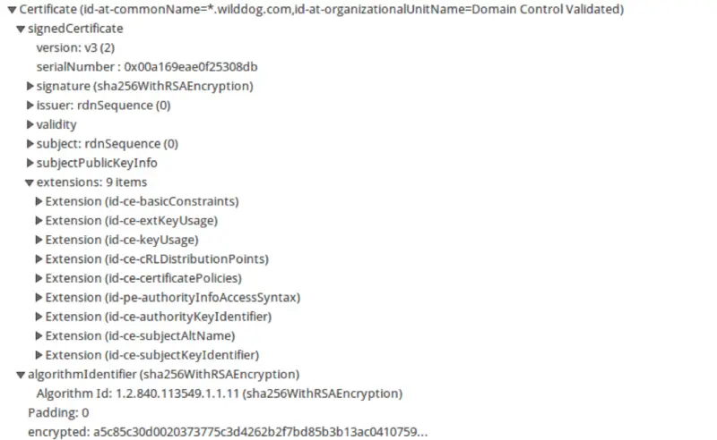 Server返回野狗官网的X.509v3证书,其包含三部分:tbsCertificate、SignatureAlgorithm、SignatureValue;