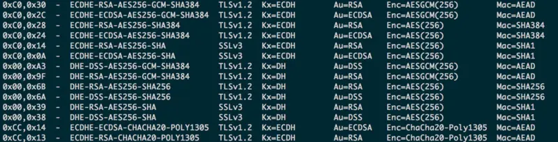 我截取了部分输出结果,其中加密套件是认证、加密、MAC、密钥交换、密钥衍生的组合,如 ECDHE-RSA-AES256-GCM-SHA384,ECDHE做密钥交换、RSA做身份认证、AES256-GCM做加密算法、SHA384做摘要。