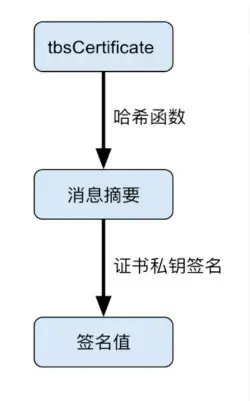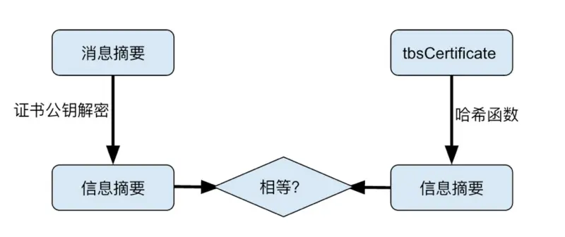 浏览器读取证书中的tbsCertificate部分(明文),使用SignatureAlgorithm中的散列函数计算得到信息摘要,并利用tbsCertificate中的公钥解密SignatureValue得到信息摘要,然后对比双方的信息摘要,判断是否一致;如果一致,则成功;如果不一致,则失败。