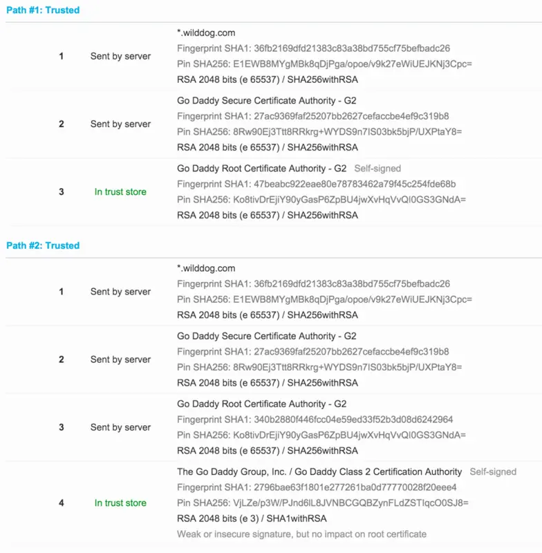 那么为什么会使用证书链?使用证书链的好处有两个:1.安全,2.保持CA的私钥离线,方便部署和撤销。如果没有证书链,那么当由CA来验证网站的证书时,如何保障这个过程中的CA是可靠的而不是伪造的。这就是证书链的作用。证书链的顶端是内置在浏览器或操作系统中的rootCA,一级一级的信任,保证了最后网站身份的可靠认证。每个证书的证书链往往是多条的,野狗官网证书的证书链有两条。