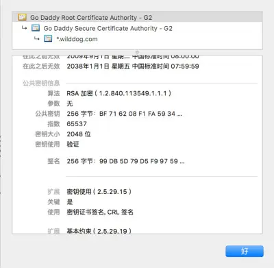这就是证书的信任链,浏览器信任内置CA证书–Go Daddy Root证书,Go Daddy Root证书信任Go Daddy Secure证书,Go Daddy Secure证书信任wilddog.com证书,所以浏览器信任wilddog.com证书。