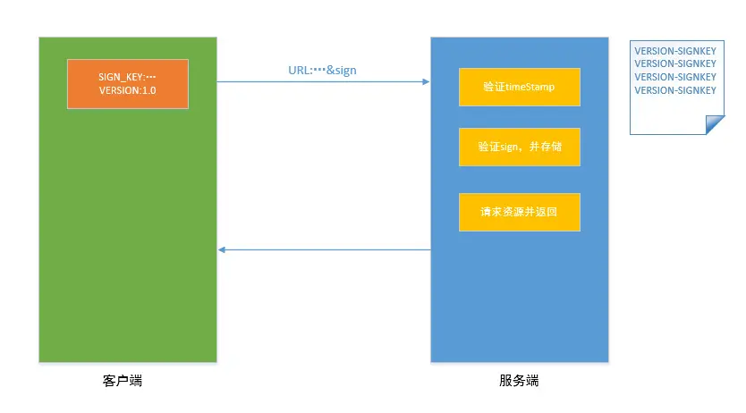 1、初始时,服务端存有各App版本的SIGN_KEY,客户端存有对应版本的SIGN_KEY