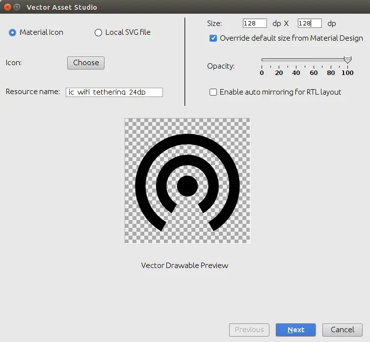 Android Studio 在1.4 支持了VectorAsset,所谓VectorAsset;它可以帮助你在Android 项目中添加Material Icon 和SVG 图片来作为一个Drawable 资源来使用。不过唯一一点的缺陷就是没有搜索功能,如果你想精心挑选Material Icon ,可以打来网页版design.google.com/icons/ 来选择,也可以下载SVG 和Png 格式。对于VectorAsset 的好处,它的文件更小,更容易适配不同的屏幕。