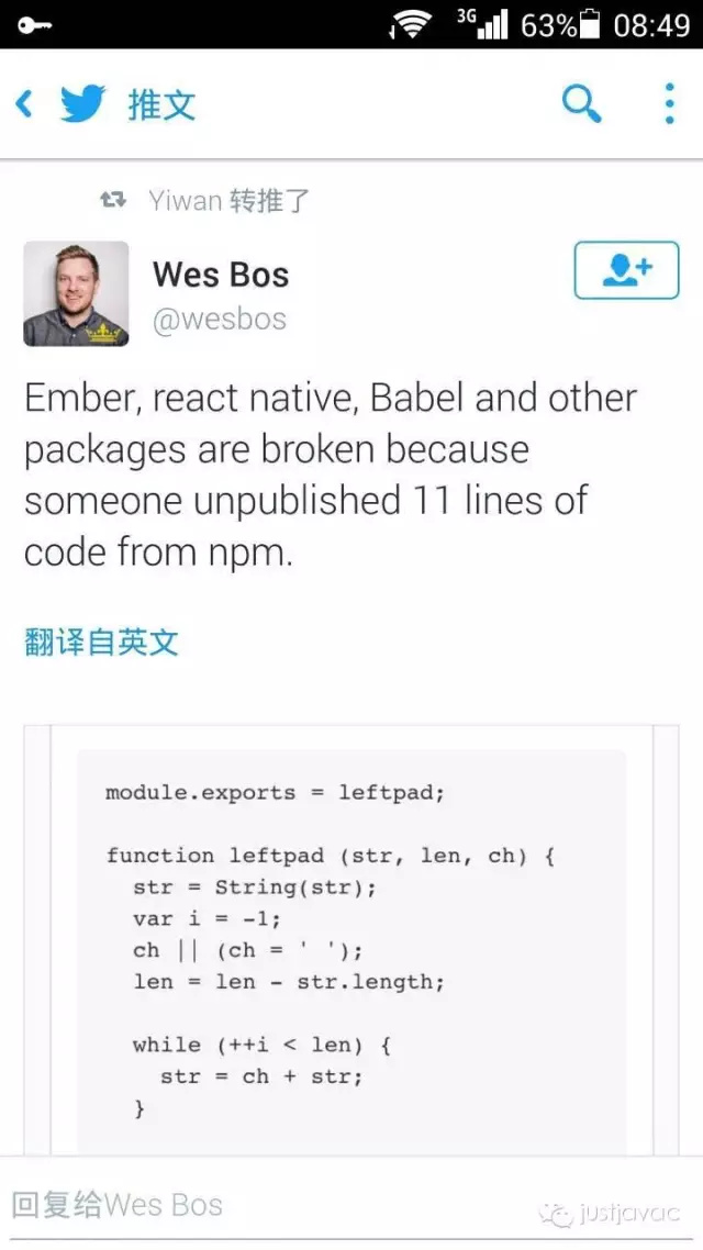 今天凌晨,一个开发者对NPM公司不满,unpublish了自己的所有模块。其中包括被广泛使用的left-pad,导致Babel、ReactNative、Ember等大量工具构建失败。目前,Babel已经紧急发布了不包括该模块的新版本。