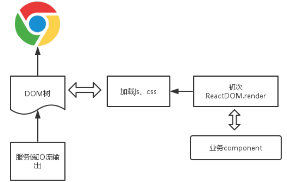 比较两张图可以看出,服务端渲染需要把 React 的初次渲染放到服务端,让 React 帮我们把业务 component 翻译成 string 类型的 DOM 树,再通过后端语言的 IO 流输出至浏览器。