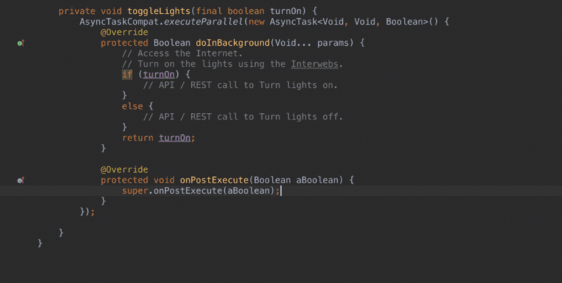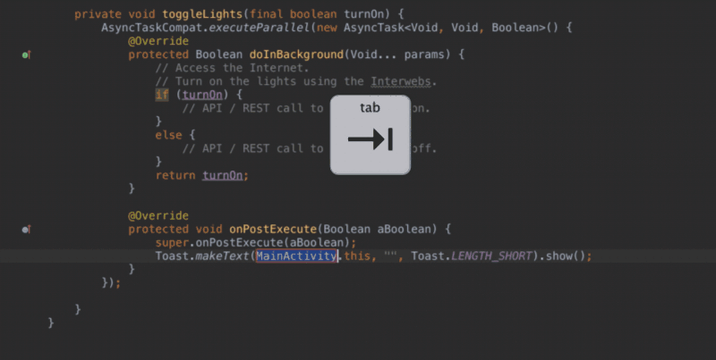 For example, as shown above — typing “Toast” then hitting the Tab key inserts the code for displaying a new Toast with argument placeholders that you can enter, before hitting tab and moving on to the next argument.