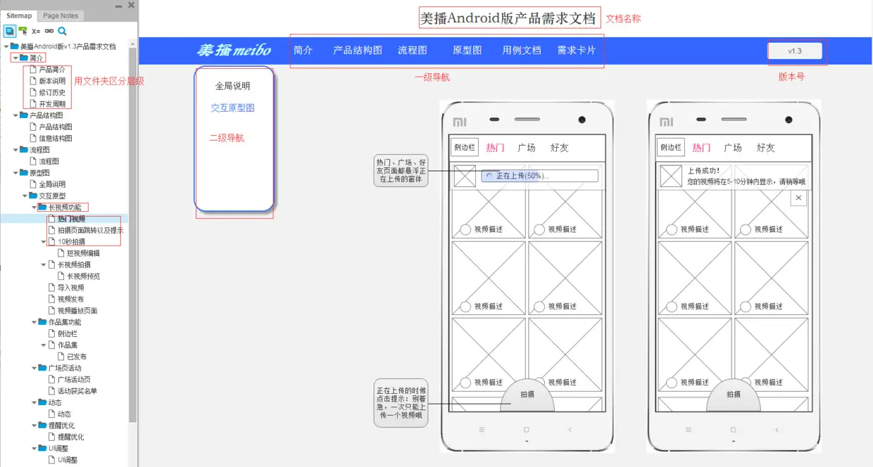 产品需求文档v2.0版本 这个是第二个大改版,做成了网页的形式,有一级导航,二级导航,还有版本号。左边的站点地图也进行了清晰的逻辑分组。