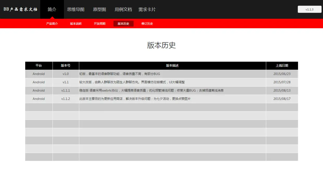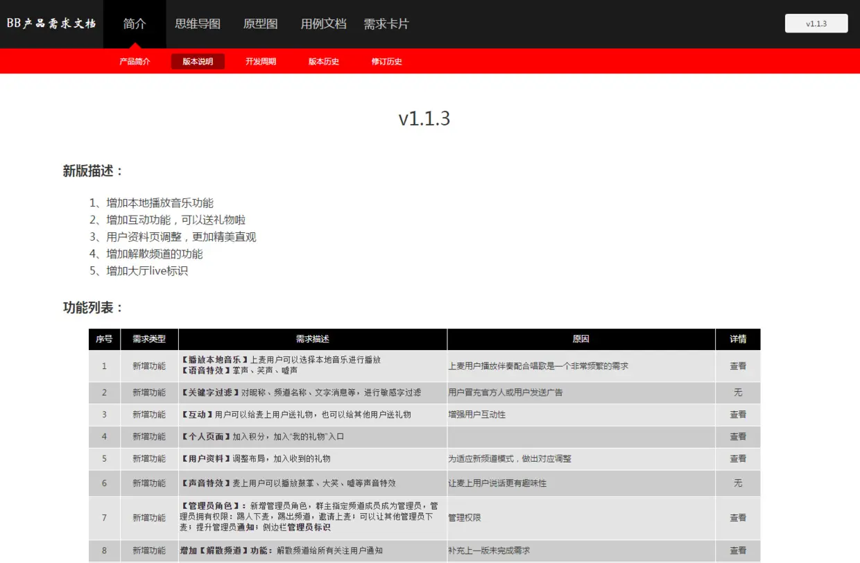 版本说明 是非常重要的版块,整个版本所有的需求都列在这里,并且已经写好了版本升级的提示内容,市场同学可以直接拿去用。开发同学通常都是参考这里来进行工作分配,点击详情按钮,可以直接跳转到原型图页面,那里有详细的需求描述