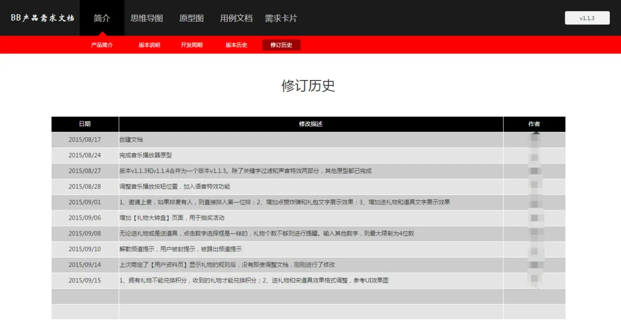 修订历史 此页面是非常重要的页面,虽然他是排在最后一个位置,但是,每次打开Axure文档都会先显示此页面。就拿需求文档来说,我还没遇到哪个版本不用进行修改的,所以产品经理一定要把每次文档调整的地方在这里清晰地写出来,方便文档读者观看,也方便自己记录