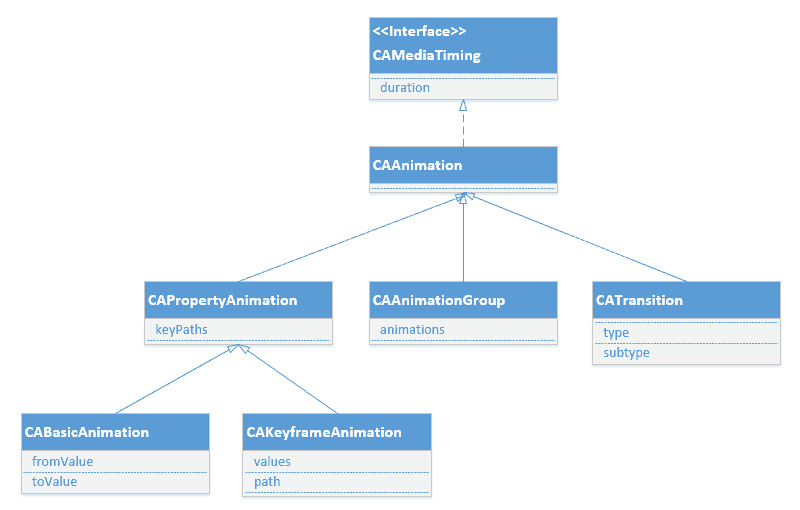 iOS中的动画主要有View级别,Layer级别.View级别动画可以利用UIView的类中animation开头的类方法实现,使用简单方便,但是无法操作更多细节,它其实就是Core Animation的封装.Layer级别的动画相对于View级别来说要底层一些,主要是使用Core Animation来实现.相关CA类如下图: