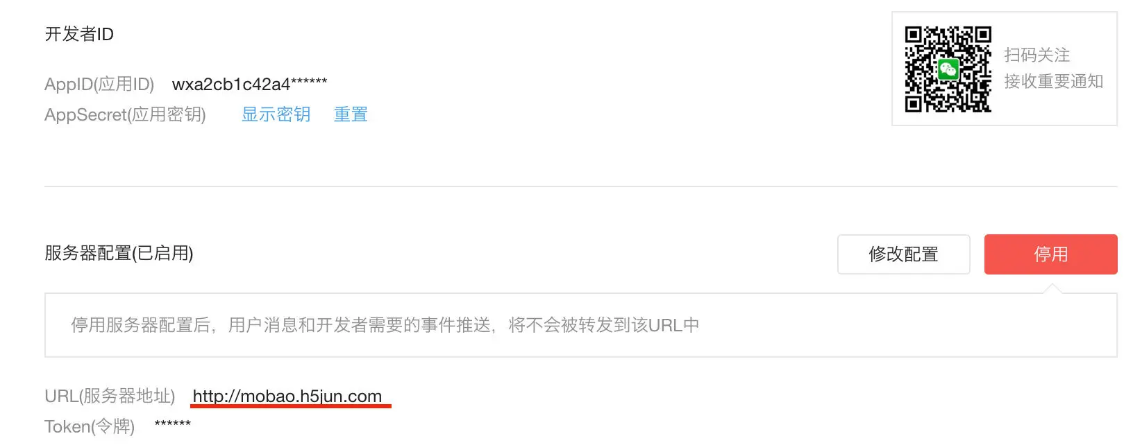 将微信服务号的服务器配置为开发服务器的URL,就可以接收到微信服务号的消息了