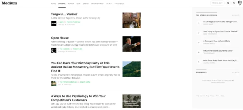 首先让我们从交互的角度来看一下用户的目标:他们想要尽快地找到有趣的内容。在主页上通过留白将放置在中间的内容进行强化。在图片周围和和每一栏之间都留置了充足的而空白,虽然在图片周围的留白要是更加统一那就更好了(图片左侧的空白与底部的空白不一致)