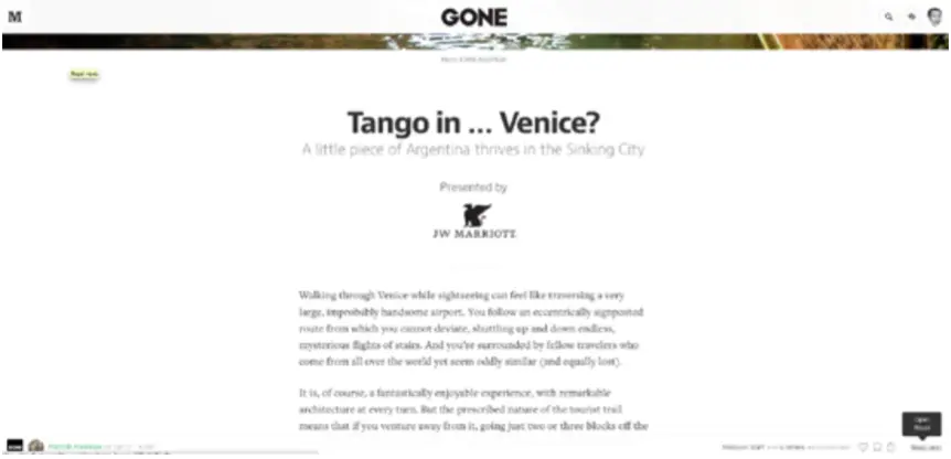 当你点击进入一篇文章时,留白能帮助用户聚焦最重要的—内容。注意在每行之间的留白是怎样提高文章的可读性的。看一个细节,在JW Marriot 的Logo通过周围的留白非但没有打扰到用户而且更加的醒目(一个对“图标要大一点,再大一点”的有力反驳)