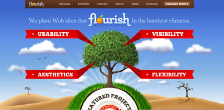 Florida Flourish 网站运用了它本身的颜色。文字标签和植物使用了红绿对比,再加上沙漠天空上使用蓝色和橙色。所以红色、橙色之间的相似及蓝绿之间的相似将网站整体看上起不错。