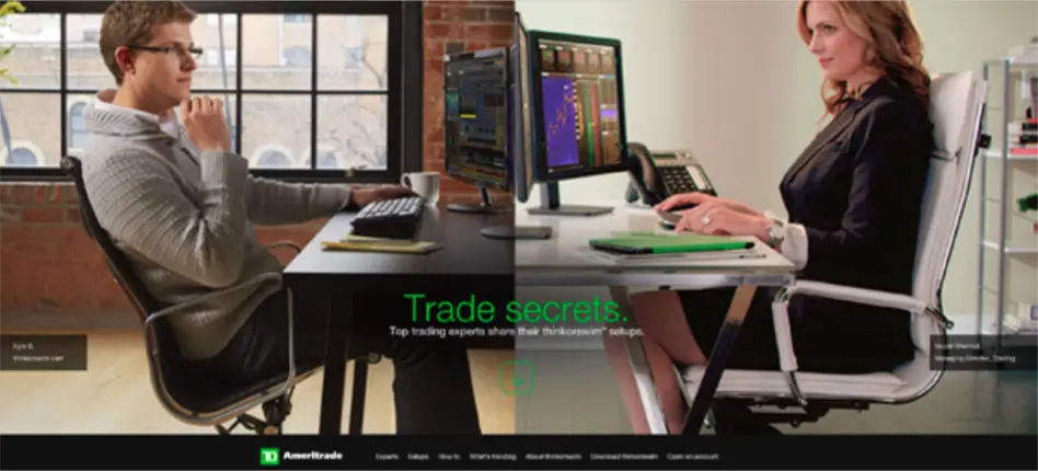绿色在暖色调和冷色调之间架起了一座桥梁,即使更多的时候被看成是冷色调。这意味着绿色拥有蓝色一样的冷静,但也有黄色的能量,由此创造出一种平衡稳固的氛围。深绿色给人一种富裕的感觉,你可以看一下上图的Ameritrade网站。