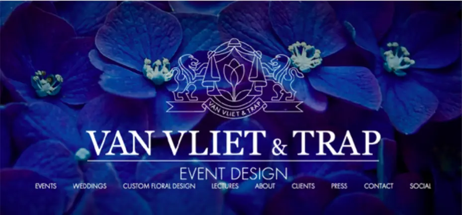 Van Vliet & Trap一个活动设计网站,蓝色用的非常好。将蓝色的花做背景,在视觉上暗示他们的主业是花艺设计,同样也流露出可信任可信赖。也为他们设计高品质的活动(如婚礼)做了完美的铺垫。
