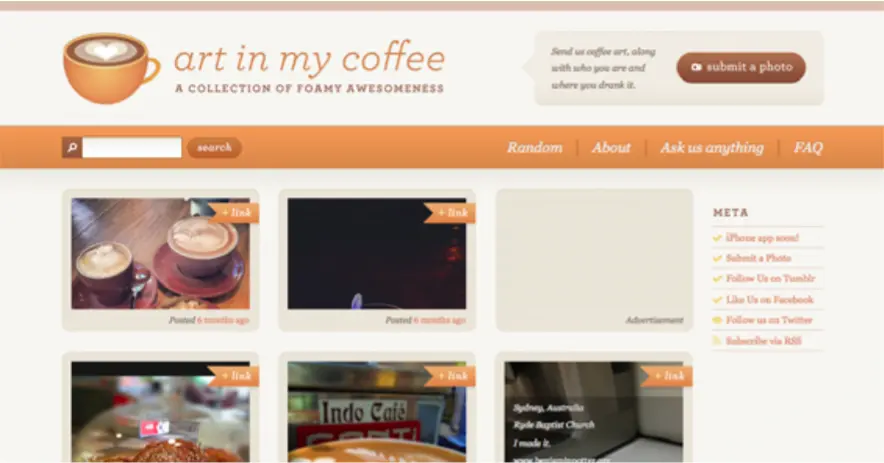 象牙色比白色来的更暖些(或者说更柔和些),在表达极简和复杂方面时让人更舒服些,象牙色一般用在降低浅色和深色的对比时。art in my coffee网站中,橘色/棕色被加入到奶油色的背景中去了(看起来稍微有点灰)让人感觉暖暖哒。