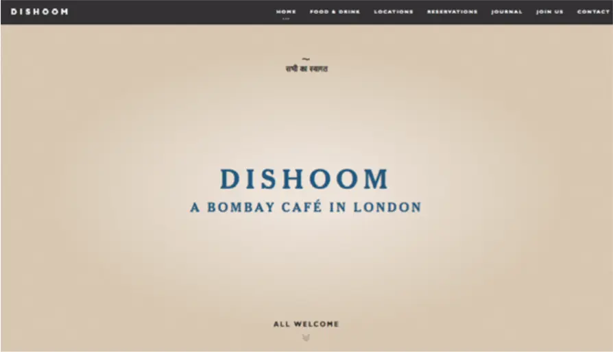 像Dishoom网站所用的色度较深的米黄色展现了一种泥土般或者纸质般的质感。色度较浅的米黄色给人一种新鲜的感觉。内亮外暗的设计会让人感觉酒店不仅时尚新鲜而且菜品带有泥土一般的原汁原味气息。(这也太扯了吧。。。)