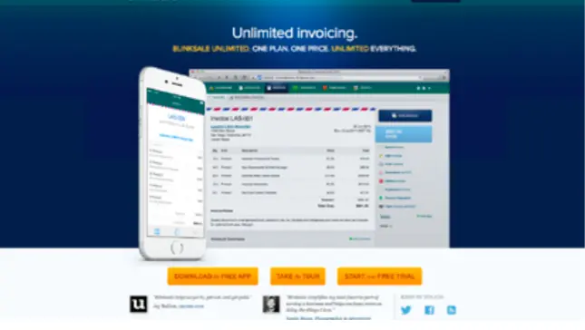 通过在相似网站上蓝色、孔雀蓝、绿色的使用,Blinksale 制造出一种平和安全的氛围。注意他们在联系电话按钮上使用的对比较为强烈的黄色来吸引用户的注意力。