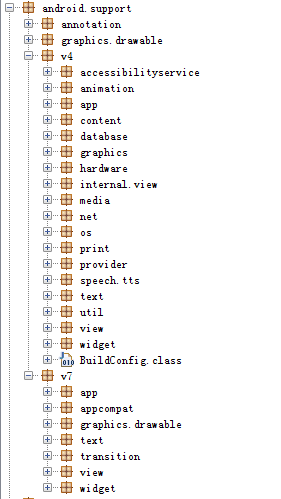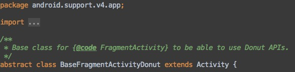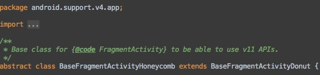 其中AppCompatActivity是在appcompat-v7包中的,它的父类FragmentActivity是在support-v4包中的,这两个包我们都已经添加依赖了。但是FragmentActivity的父类就坑爹了,如果你去看BaseFragmentActivityHoneycomb和BaseFragmentActivityDonut这两个类的源码,你会发现它们都是在support-v4包中的:
