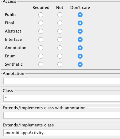 | * | 匹配任意长度字符,但不含包名分隔符(.)。比如说我们的完整类名是com.example.test.MyActivity,使用com.*,或者com.exmaple.*都是无法匹配的,因为*无法匹配包名中的分隔符,正确的匹配方式是com.exmaple.*.*,或者com.exmaple.test.*,这些都是可以的。但如果你不写任何其它内容,只有一个*,那就表示匹配所有的东西。 |