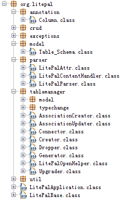 可以看到,现在android-support包中所有代码都被保留下来了,不管是包名、类名、还是方法名都没有被混淆。LitePal中的代码也是同样的情况: