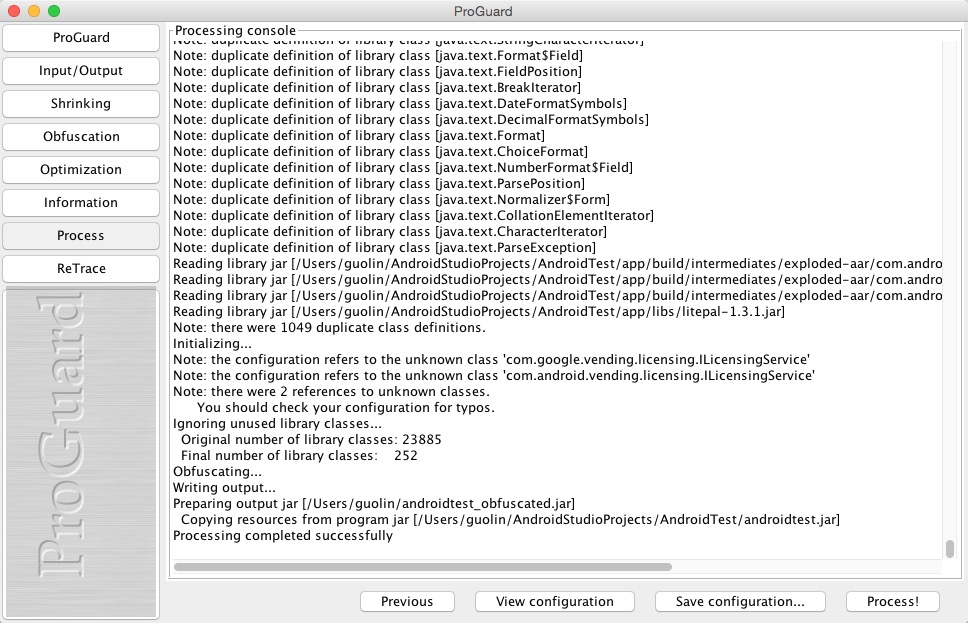 最后点击Process!按钮来开始混淆处理,中间会提示一大堆的Note信息,我们不用理会,只要看到最终显示Processing completed successfully,就说明混淆Jar包已经成功了,如下图所示: