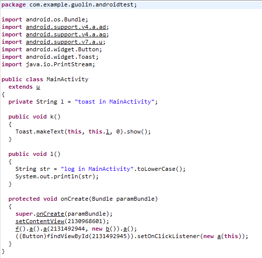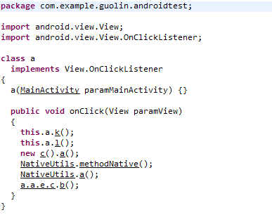 很明显,这个是MainActivity中按钮点击事件的匿名类,在onClick()方法中的调用代码虽然都被混淆了,但是调用顺序是不会改变的,对照源代码就可以看出哪一行是调用的什么方法了。