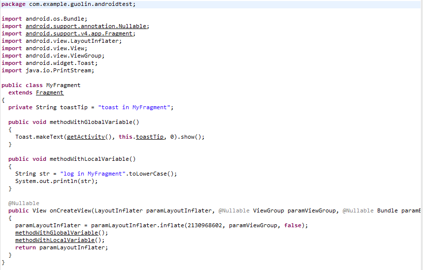 可以看到,MyFragment是继承自Fragment的,并且MyFragment中有一个全局变量。onCreateView()方法是Fragment的生命周期函数,这个不用多说,在onCreateView()方法中又调用了methodWithGlobalVariable()和methodWithLocalVariable()方法,这两个方法的内部分别引用了一个全局变量和一个局部变量。