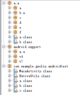 下面我们尝试来阅读一下这个混淆过后的代码,最顶层的包名结构主要分为三部分,第一个a.a已经被混淆的面目全非了,但是可以猜测出这个包下是LitePal的所有代码。第二个android.support可以猜测出是我们引用的android support库的代码,第三个com.example.guolin.androidtest则很明显就是我们项目的主包名了,下面将里面所有的类一个个打开看一下。