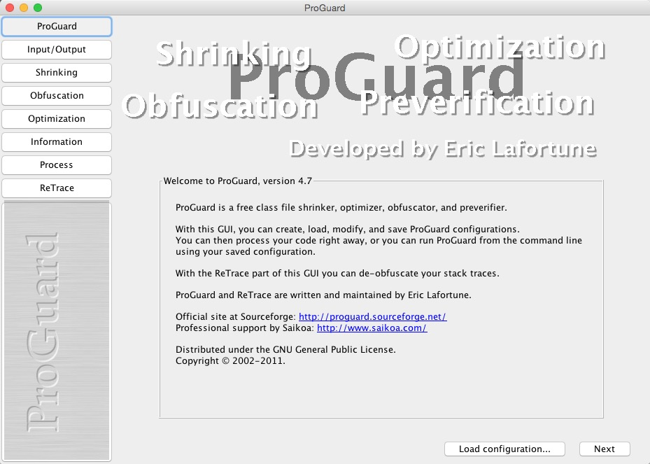 那么我们从/tools/proguard目录下将proguard-android.txt文件复制一份出来,然后点击主界面上的Load configuration按钮来加载复制出来的这份proguard-android.txt文件,完成后点击Next将进入Input/Output界面。