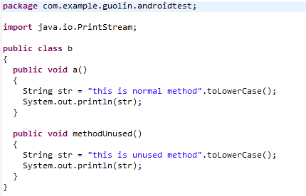 这是一个非常普通的工具类,没有任何继承关系。Utils中有两个方法methodNormal()和methodUnused(),它们的内部逻辑都是一样的,唯一的据别是稍后methodNormal()方法会被调用,而methodUnused()方法不会被调用。
