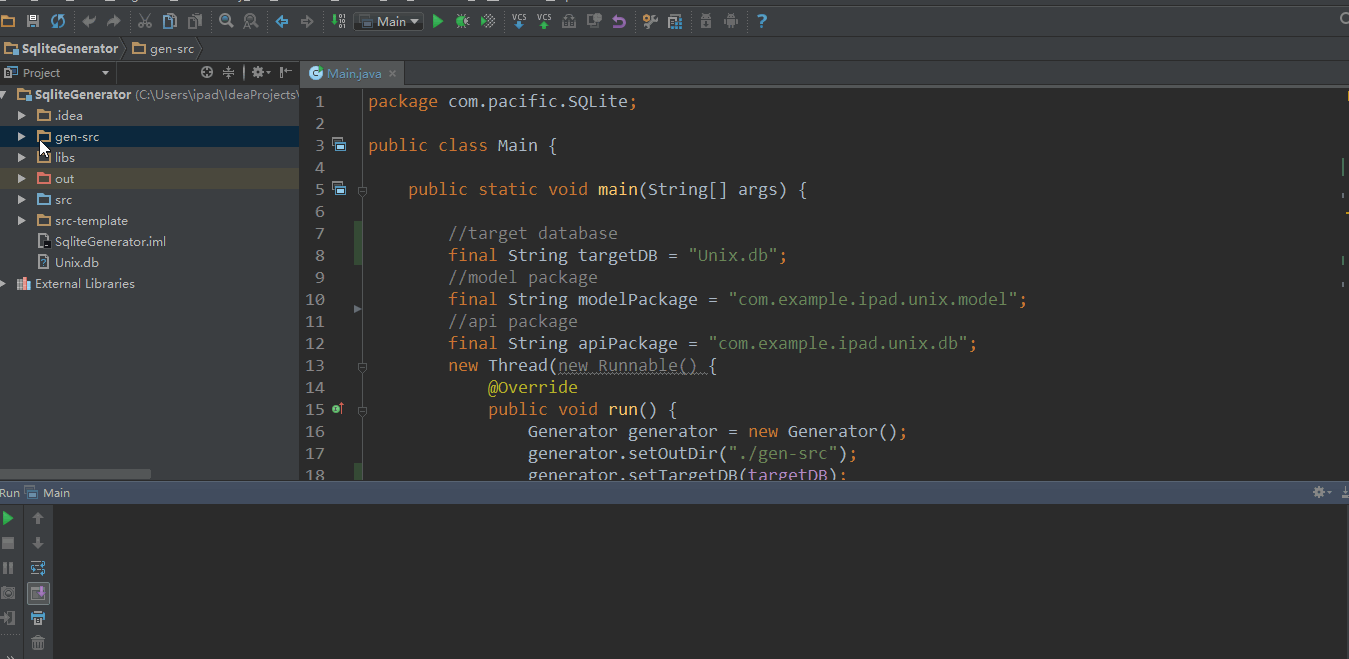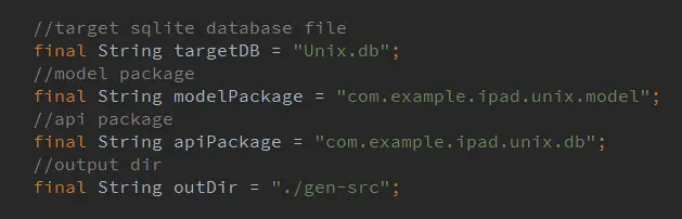 到该代码生成器github项目主页Clone源代码后,用IntelliJ开发工具(如果你使用的是Eclipse,请自行拷贝源码)打开项目,把你的目标sqlite数据库放在项目根目录下(源码中有一个测试Unix.db数据库)。然后修改入口Main函数下的四行代码,具体看下面实例: