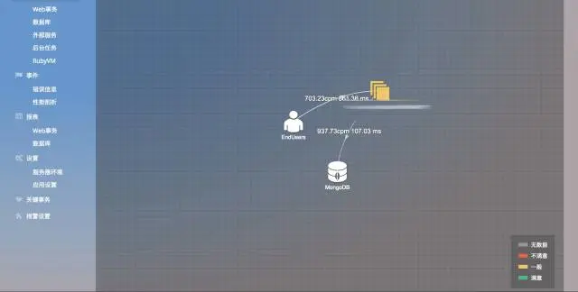 OneAPM 通过拓扑图来展示应用的端到端调用关系、应用服务器与数据库、外部 服务的调用关系以及应用之间的调用关系。同时,通过在拓扑图中将相应模块标记成不同颜色。
