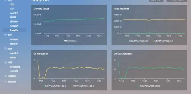 这个对于实时监控挺有用,但是这个仅仅是适用 vm 以及 ruby gc 的一些统计,如果能加入对 ruby container 的监控就更好了,因为我遇到过很多次,web 缓慢或者瘫痪的时候,几次都是因为 ruby container 内存溢出,导致宕机。但是对这块的监控就比在 ruby 或者 ror 中加探针要复杂很多了。