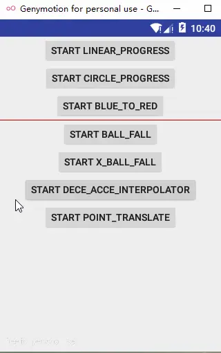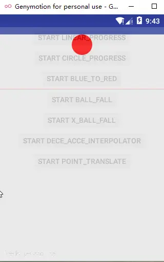 当你没有为动画设置插值器时,系统默认会帮你设置加减速插值器AccelerateDecelerateInterpolator,我们不妨来看一个实例效果图如下,小球从静止开始先做加速运动再做减速运动最后停止,效果还是很明显的: