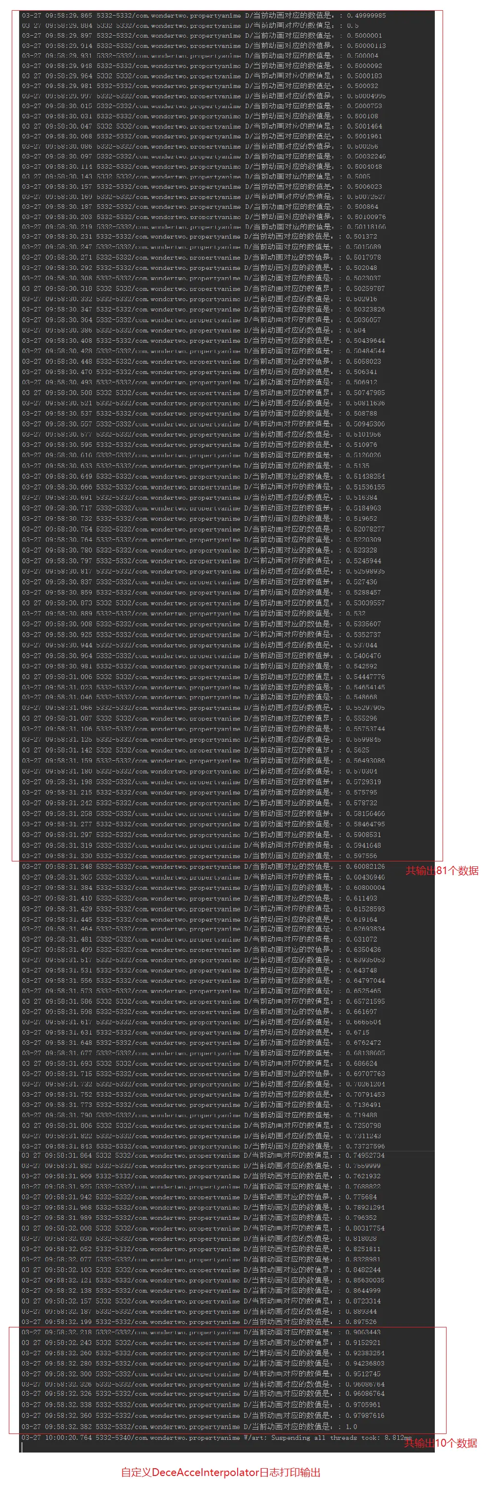 很明显可以看出来,小球的运动是先减速直到停下来,再加速到达终点。下图展示了动画执行过程中fraction参数的变化情况,由于数据太多我只展示了后半段数据,可以看到[0.5~0.6]区段打印了81个数据,而[0.9~1.0]区段只打印了10个数据,这也可以看出来后半段是一个加速的过程: