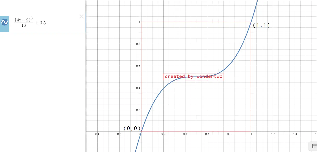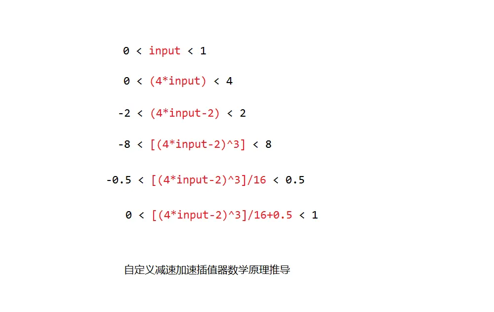 在getInterpolation(float input)方法中返回值只有一行代码,很简单吧!把返回值((4*input-2)*(4*input-2)*(4*input-2))/16f + 0.5f翻译成数学表达式如下: