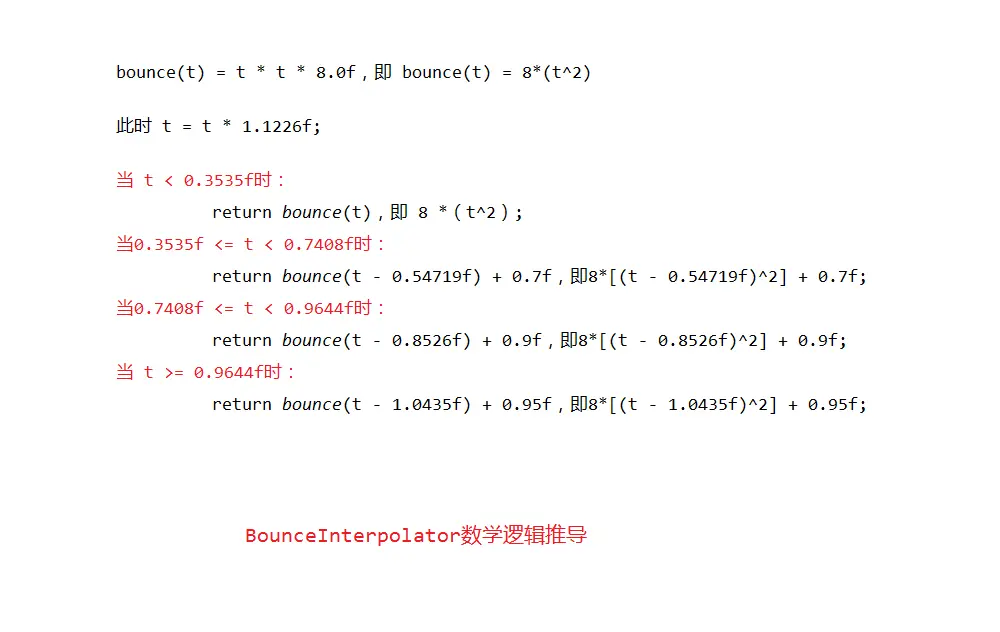 getInterpolation()方法干的第一件事就是重新为变量t赋值,然后根据t取值范围的不同,调用bounce(float t)方法来计算返回值,而bounce(float t)方法很明显是一个二次函数,再稍微观察一下你会发现它其实就是一个分段二次函数,看完下图的详细推导过程你就会明白为什么啦: