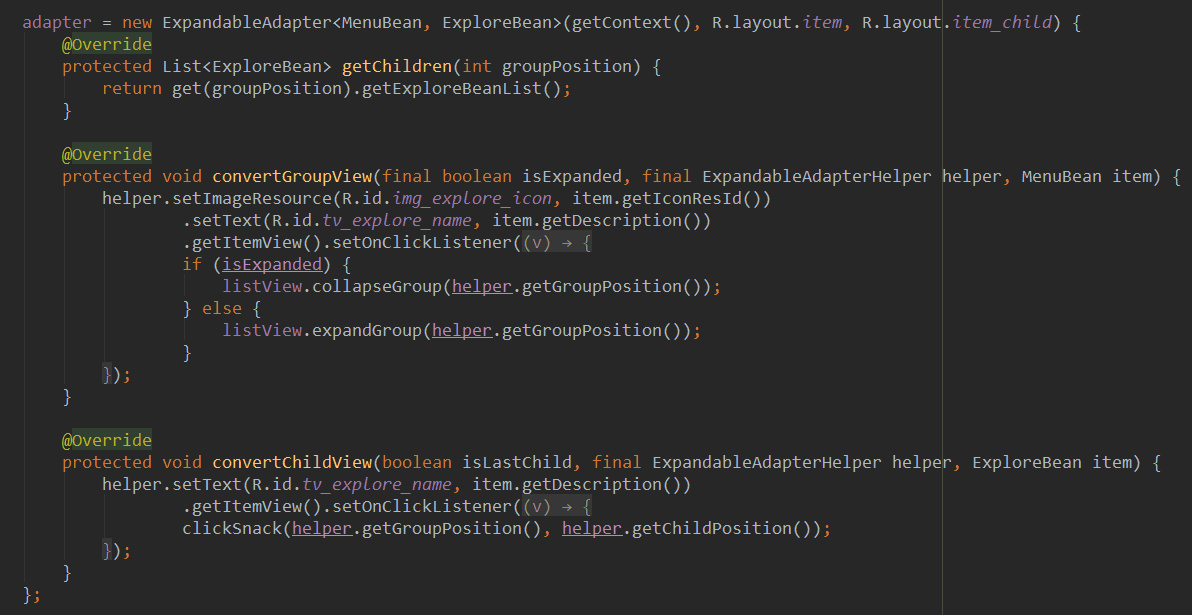 继承和扩展相应的adapter基类(ExpandableAdapter用于ExpandableListView),然后重写adapter类的getChildren、convertGroupView、convertChildView方法即可。具体代码如下图: