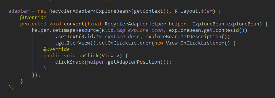 继承和扩展相应的adapter基类(RecyclerAdapte用于RecyclerView ,Adapter用于ListView,GridView),然后重写adapter类的convert方法即可。具体代码如下图: