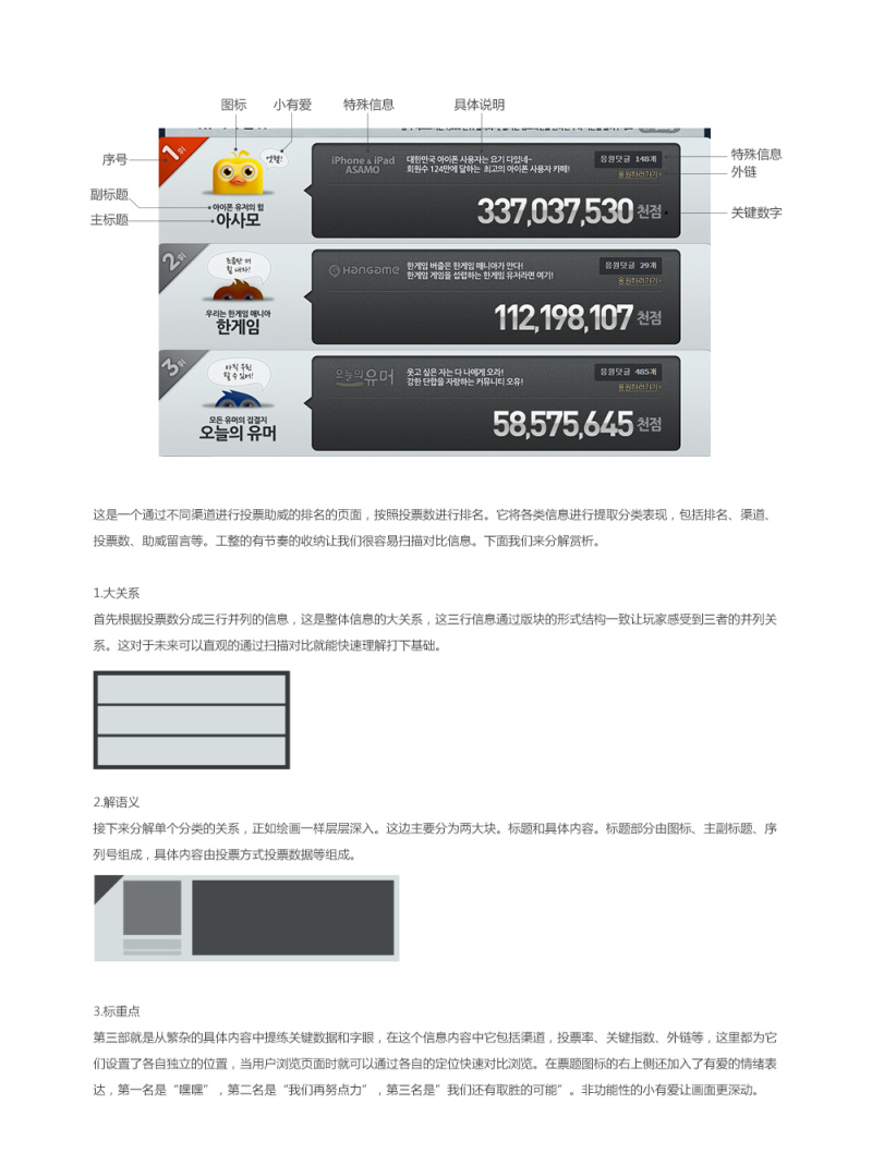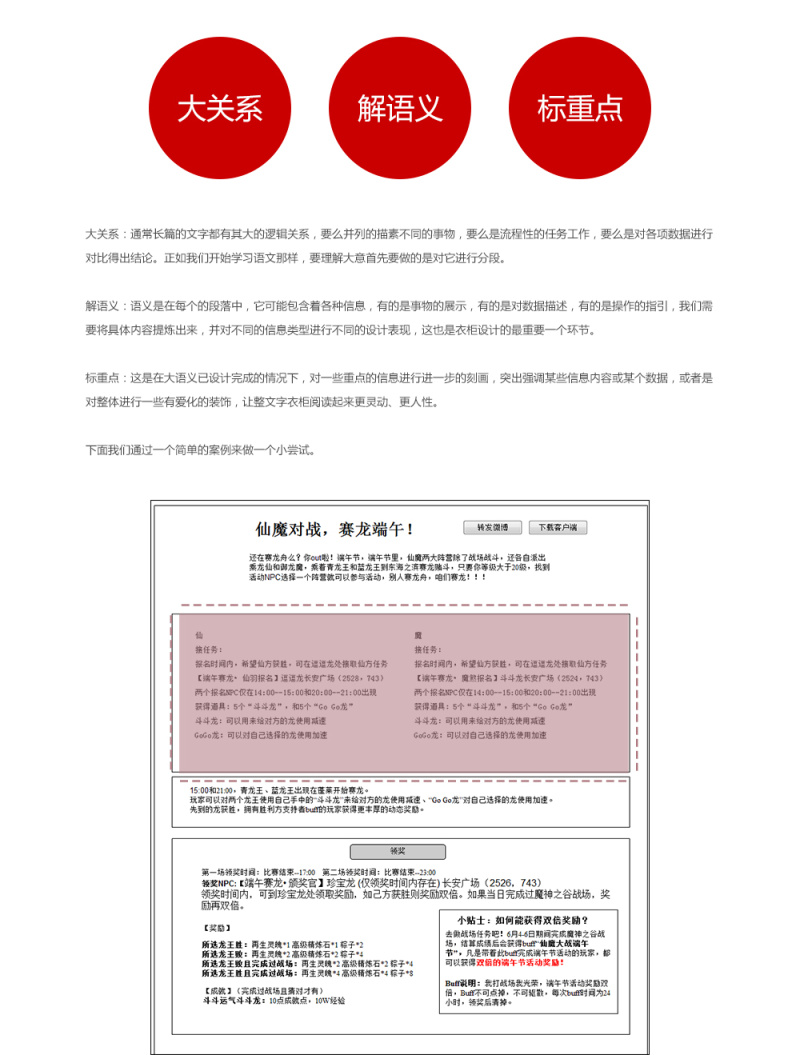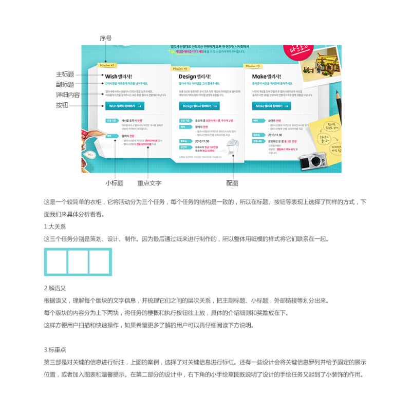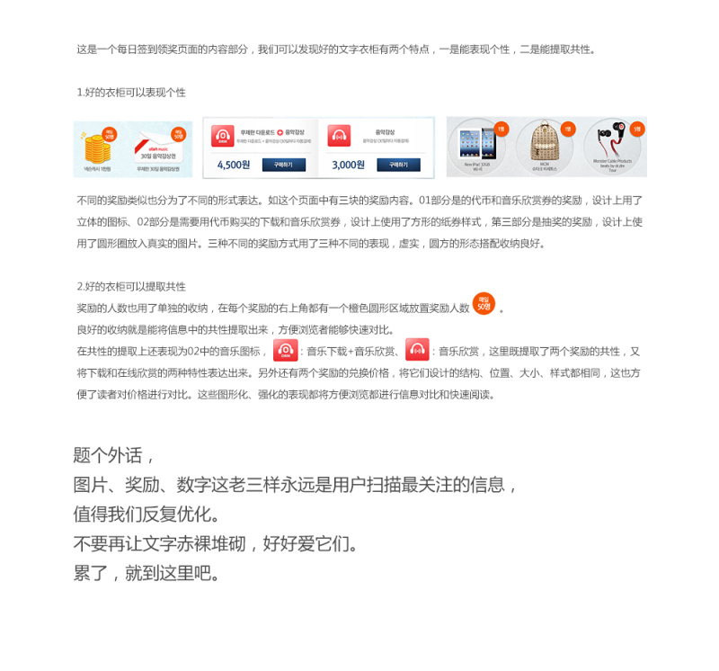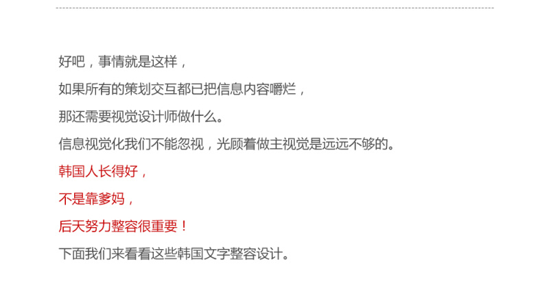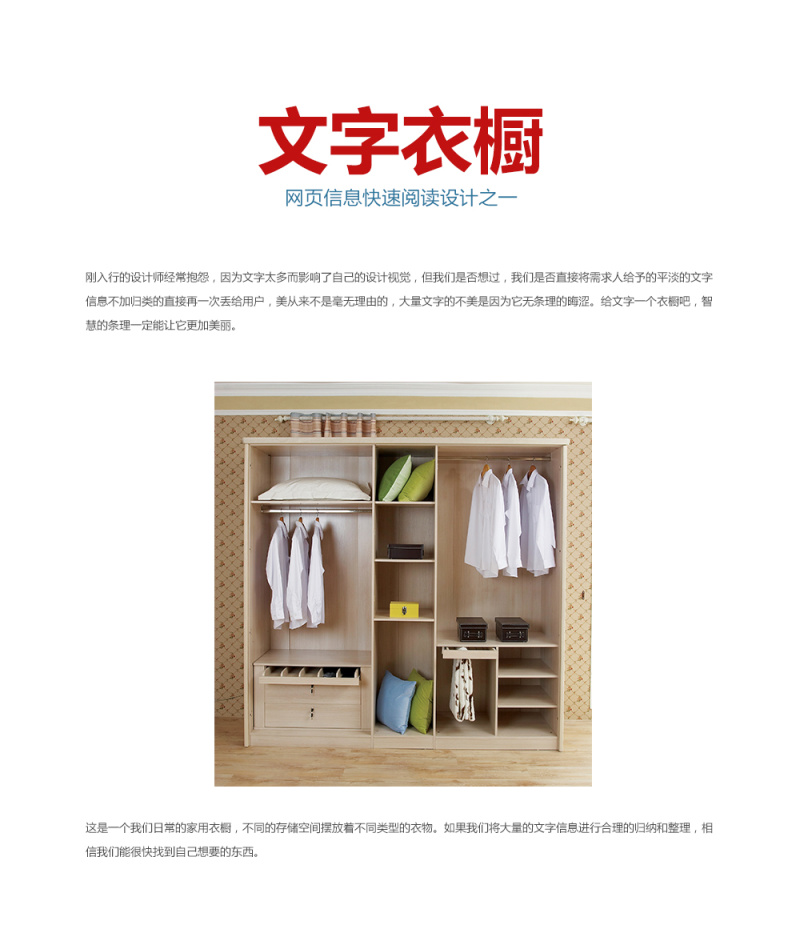 设计方法第八集:文字衣橱 AleCC 2016-03-29 845 阅读1分钟 原文链接: www.zcool.com.cn 刚入行的设计师经常抱怨,因为文字太多而影响了自己的设计视觉,但我们是否想过,我们是否直接将需求人给予的平淡的文字信息不加归类的直接再一次丢给用户,美从来不是毫无理由的,大量文字的不美是因为它无条理的晦涩。给文字一个衣橱吧,智慧的条理一定能让 文章-下载(0.0M) ©版权归 一_视觉 所有,如需商业用途或转载请与 一_视觉 联系,谢谢配合!